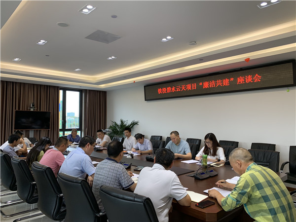 7月18日,恒祥公司黨支部組織召開了鐵投.碧水云天項目“廉潔共建”座談會,會議由黨支部書記、執行董事、總經理楊明主持,恒祥公司全體黨員干部、工程部現場管理人員,各施工總承包方負責人,監理單位負責人,共建方聯絡員,共計19人參加座談。